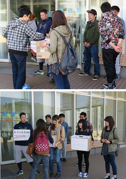「平成28年熊本県熊本地震」の被災者支援のため、熊本県出身者15名(代表:海洋生産管理学科4年、平野悠史)が発起人となり、18日(月)から講義棟及び学生コミュニティホールにて募金活動を行っている。 代表の平野さんは「不安な毎日を送っている被災地の方に少しでも役立ててほしい、という一心から活動をはじめました。水産大学校の善意を届けたい。」と話している。 募金活動は、4月22日(金)までの予定。集まった義援金は、日本赤十字社「平成28年熊本地震災害義援金」へ届ける。 義援金趣意書はこちらをご覧下さい。 ![]() |